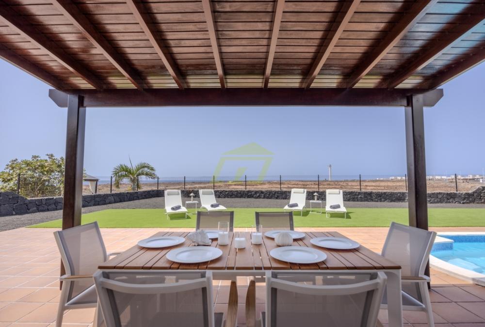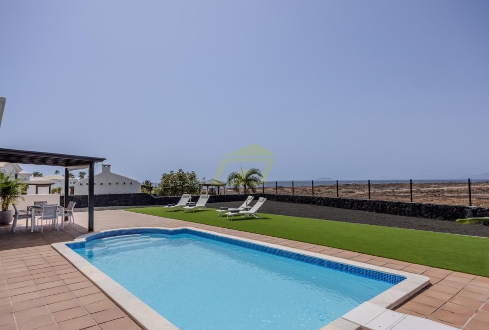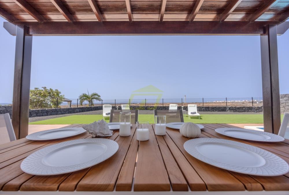 Diese makellose Villa befindet sich auf einem großen Privatgrundstück mit beeindruckendem Meerblick und befindet sich in einem echten Musterhauszustand. Die Außenbereiche bieten Privatsphäre und Komfort mit großzügigen Terrassen und angelegten, pflegeleichten Gärten – ein perfekter Ort zum Entspannen oder Unterhalten, während Sie das schöne Klima und die Aussicht von Playa Blanca genießen. Ein schattiger Essbereich im Freien rundet die Oase im Freien ab – ideal für lange, gemütliche Abende in der Sonne oder ein kühles Getränk bei Sonnenuntergang.