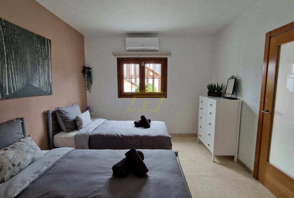 Im Inneren bietet die Villa ein helles und geräumiges Wohnzimmer, eine voll ausgestattete Küche mit hochwertigen Geräten und fünf komfortable Schlafzimmer, ideal für große Familien oder Feriengäste. Das Anwesen verfügt über drei Badezimmer, alle mit eleganter Ausstattung. Eine Klimaanlage sorgt das ganze Jahr über für Komfort.