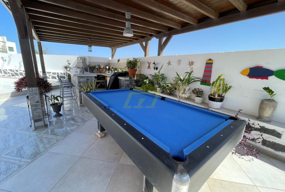 La planta principal cuenta con una cocina espaciosa y bien equipada, un luminoso salón-comedor, un segundo baño y una habitación adicional, actualmente utilizada como despacho, ideal para teletrabajar o convertirla en dormitorio de invitados. Desde esta planta, se accede a un patio que da acceso a una impresionante terraza-jardín, con zona de barbacoa, bar al aire libre, salón chill-out y billar, el entorno perfecto para disfrutar del sol de Lanzarote. Desde la terraza, también se pueden disfrutar vistas parciales al mar.